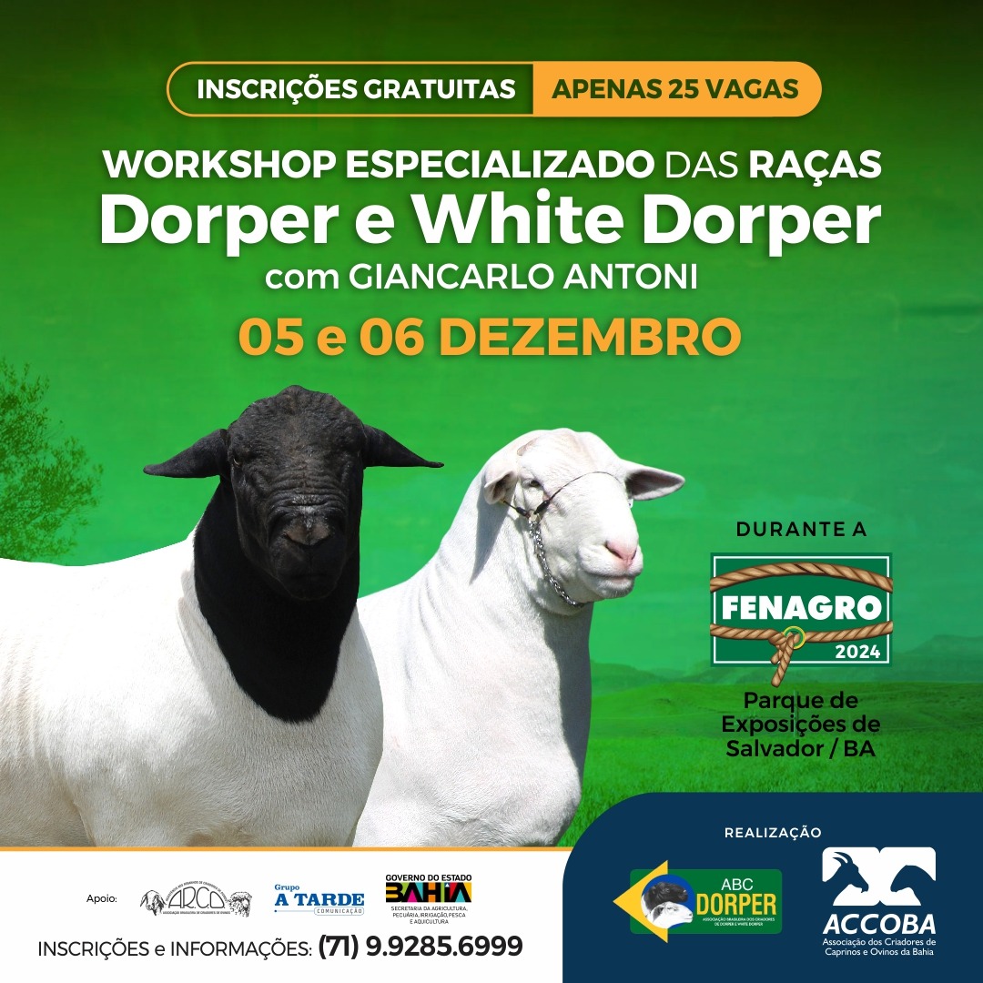 NOTÍCIAS 14/07/2024WORKSHOP ESPECIALIZADO DAS RAÇASDORPER E WHITE DORPER - 05 E 06 DE DEZEMBRO - INSCRICOES GRATUITAS -> (71) 992856999